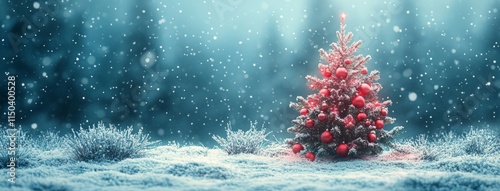 Snowfall Creates a Magical Winter Wonderland Around a Decorated Christmas Tree With Red Ornaments, Set in a Tranquil Forest Landscape