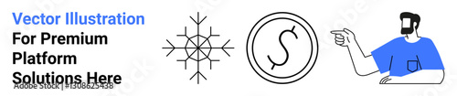 Snowflake and coin icons combined with a pointing character. Ideal for business, finance, technology, branding, advertising, corporate identity, promotional media, flat landing page banner