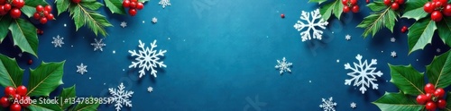 Snowflake design on blue background with festive holly leaves and berries, Pattern, Festive, Berries