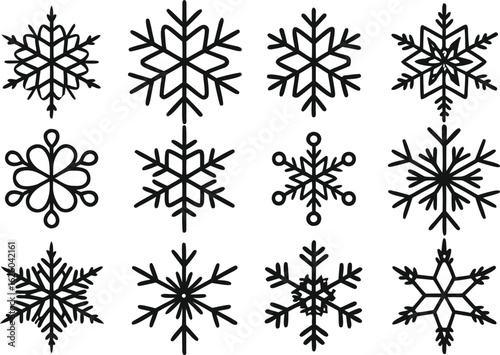 Snowflake Icons Set for Winter and Seasonal Design Projects. Decorative Snowflake Icons for Holiday and Christmas Artwork. Minimal Snowflake Icons for Winter Digital and Print Graphics
