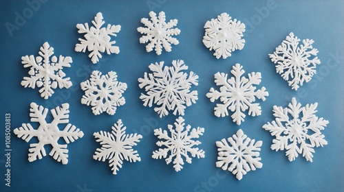 Snowflake ornaments in various sizes, isolated with a soft winter blue background, gentle glow around edges
