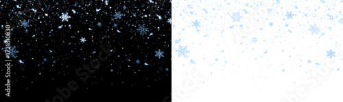 Snowflake overlay illustration featuring delicate white and blue snowflakes on contrasting black and white backgrounds, perfect for winter-themed designs and festive decorations