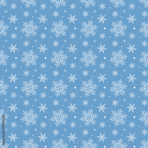 Snowflake simple seamless pattern. White snow on blue background. Winter symbol, Merry Christmas holiday