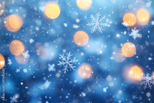 Snowflakes falling on a blue background with bokeh lights, a Christmas and New Year abstract illustration.