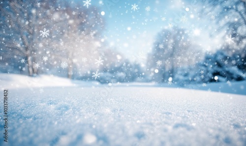 Snowflakes falling on a snowy landscape.
