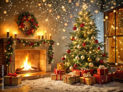 Snowflakes gently fall on a festive holiday scene, with twinkling lights adorning a decorated tree, surrounded by wrapped gifts and a warm, crackling fireplace.