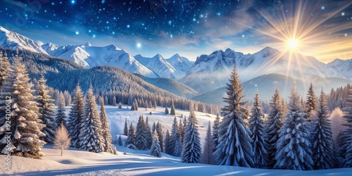 Snowflakes gently fall on majestic mountains and frozen forests, evoking a serene and enchanting festive atmosphere, perfect for the magic of winter holidays.