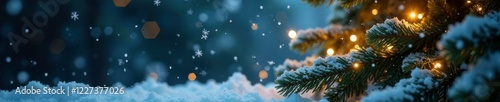 Snowflakes gently falling around a Christmas tree, shining icicles, illuminated evergreen tree