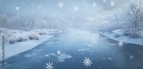 Snowflakes gently falling on a frozen river surrounded by snow-covered banks
