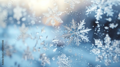 Snowflakes on a window, intricate patterns, closeup, macro focus, soft focus background, delicate and intricate