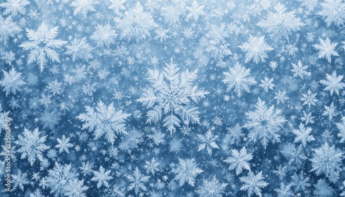 Snowflakes on icy blue background. Close-up snowflakes scattered across a cool blue frost backdrop.
