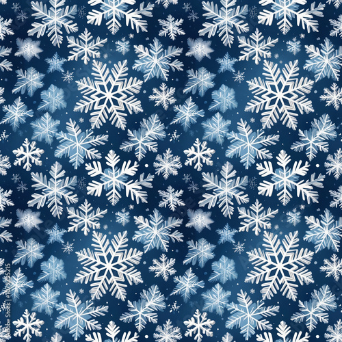 Snowflakes pattern in white on a deep blue background with soft glow effects and copy space