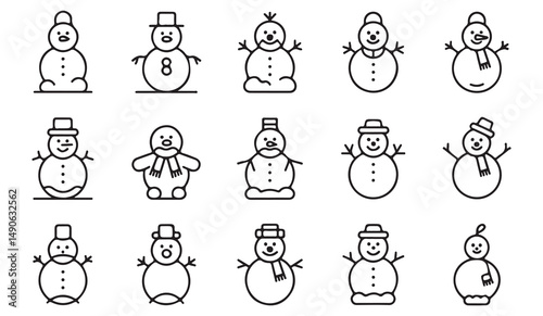Snowman Icons Collection - Set of Minimalistic Line Art Snowmen with Scarves, Hats, and Buttons