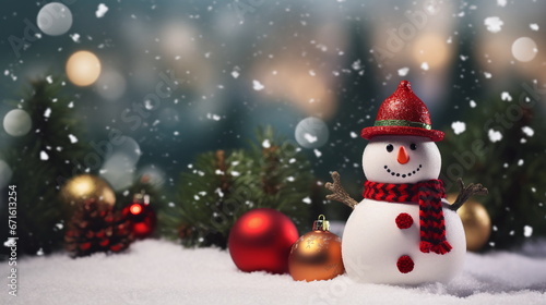 Snowman on a background of Christmas balls and a fir branch copy space