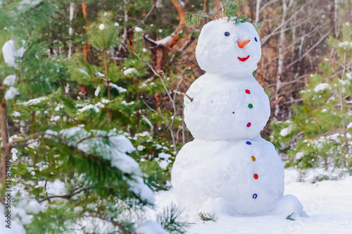 Snowman stuck together out of the snow in the forest