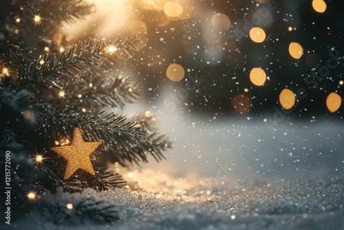 Snowy Christmas tree branch with lights and star ornament. Perfect for holiday greeting cards, winter backgrounds, or festive promotions.