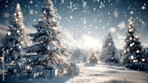 Snowy Christmas Tree With Presents In Winter Wonderland