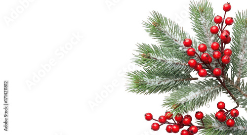 Snowy evergreen boughs with red berries