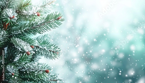 Snowy Fir Tree Branch On Blue Background Winter Wonderland With Copy Space. Christmas Concept.