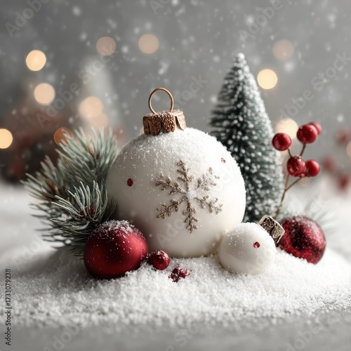 Snowy holiday decoration featuring elegant glass ornaments and festive greenery in a cozy setting