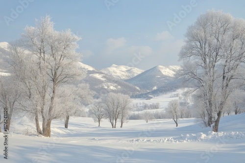 Snowy landscape with frost-covered trees and mountains in the background. Perfect for winter, nature, and serenity themed projects.