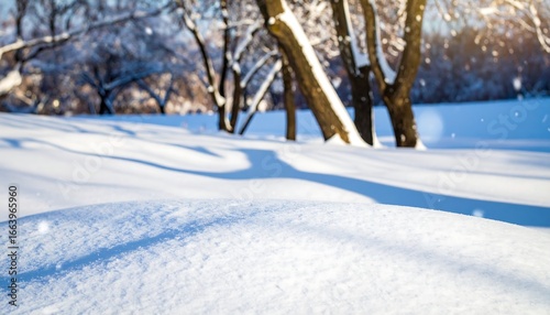 Snowy landscape with gentle undulations and the soft shadows of trees.