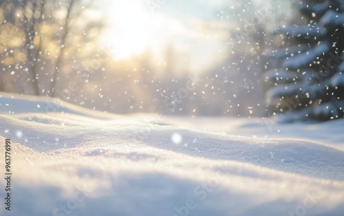 Snowy landscape with soft snowdrifts and gentle falling snow, set against a blurred background of winter trees and a cloudy sky