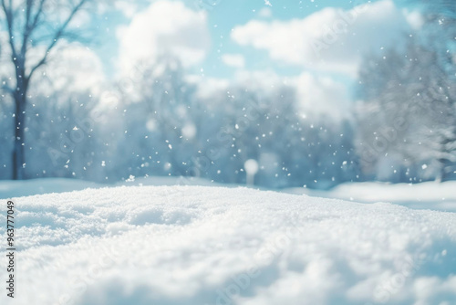 Snowy landscape with soft snowdrifts and gentle falling snow, set against a blurred background of winter trees and a cloudy sky