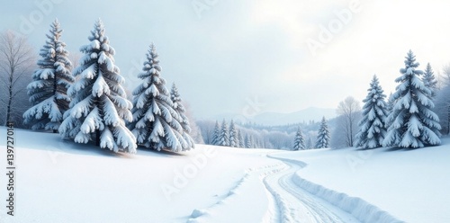 Snowy landscape with trees and a winding path on a white paper texture background, forestry, frosty atmosphere, natural scenery