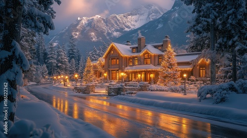 Snowy mountain chalet at night, illuminated, reflecting lights on icy road.