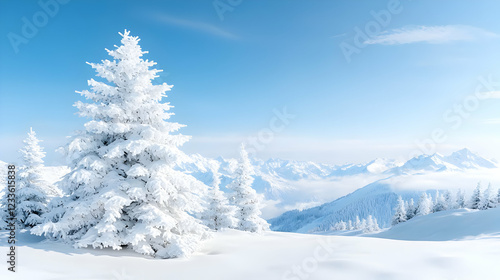 Snowy mountain landscape with frosted trees, winter wonderland postcard