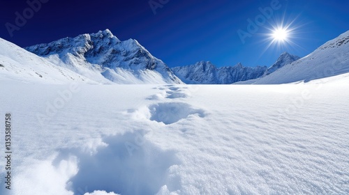 Snowy mountain path under a brilliant blue sky. Footprints on pristine snow leading into a vast landscape