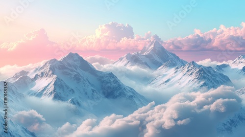 Snowy mountain peaks above clouds at sunset; idyllic landscape
