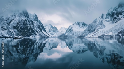 Snowy mountain peaks reflecting in a calm alpine lake