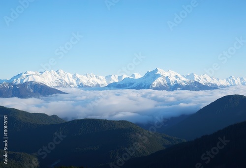 Snowy mountain peaks rising above a forested landscape under a clear blue sky
