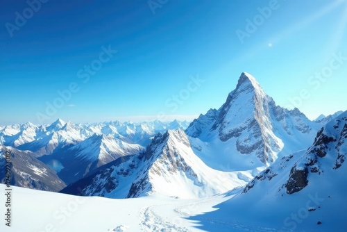 Snowy mountain peaks touch the bright blue sky at midday, snow, peak