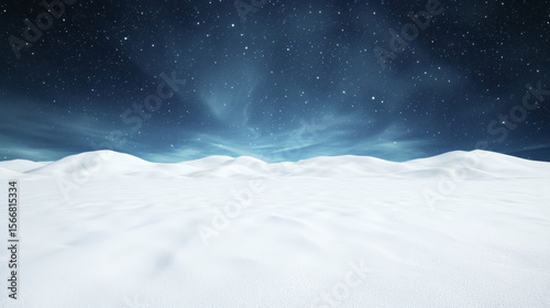 Snowy open field with northern lights dancing under starry night sky
