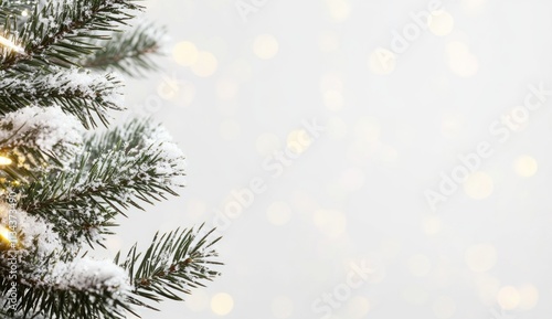 Snowy pine branch with lights, bokeh background.