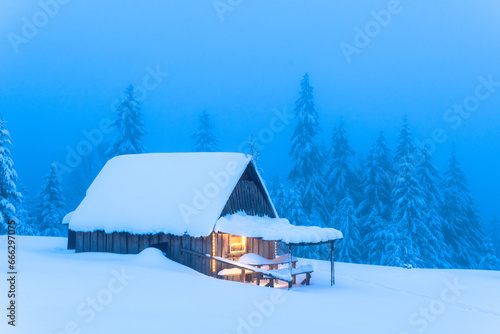 Snowy pine trees and a solitary wooden house in a forested mountain glade in the wintertime. Christmas postcard. Snowy mountains forest