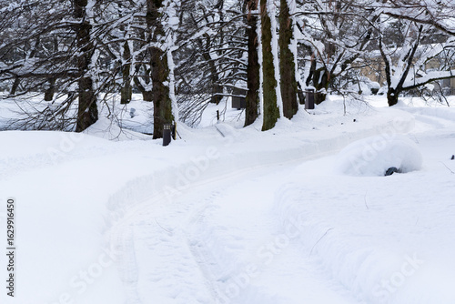 Snowy roads and ruts in a winter forest
