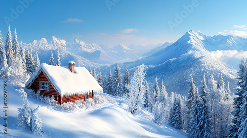 Snowy winter landscape featuring a cozy cabin surrounded by frosted trees under a clear blue sky with a tranquil atmosphere and space for captions on the side creating a serene winter scene