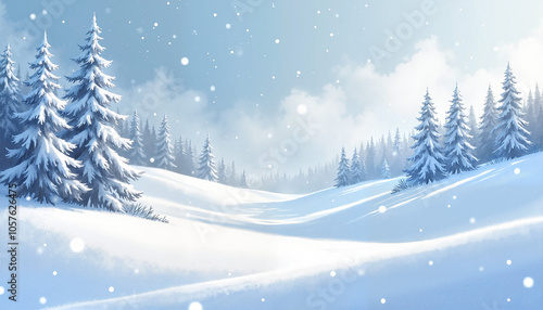 Snowy winter landscape with pine trees and soft snowflakes in a serene setting