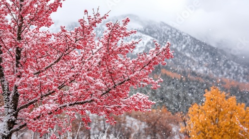 Snowy Winter Landscape with Red Berries and Mountain Backdrop