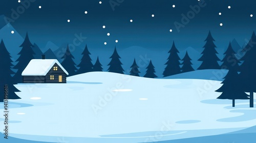 Snowy winter night landscape with cozy cabin