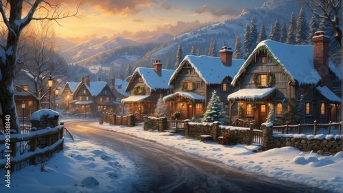 Snowy winter scene with cozy village houses