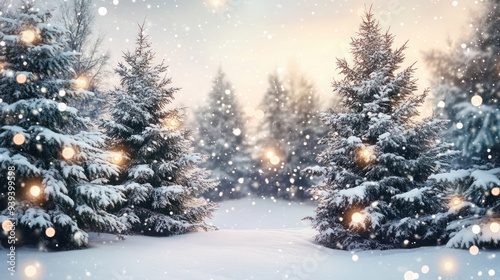snowy winter scene with pine trees and twinkling lights