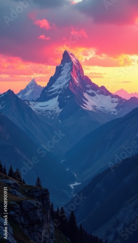 Soaring mountain peaks meet the sky at sunset, sunset, gradient textures