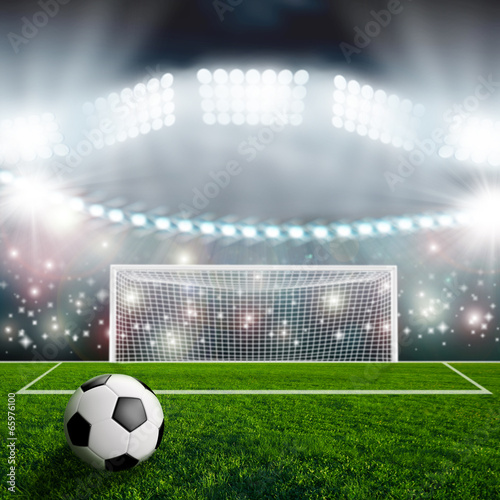 Soccer ball on green stadium arena