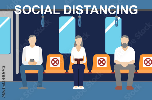 Social distancing concept, people on train keep space between each chair for avoid getting virus, vector flat design.
