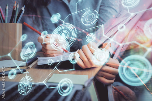 Social network theme hologram over hands taking notes background. Concept of global international people connect. Double exposure
